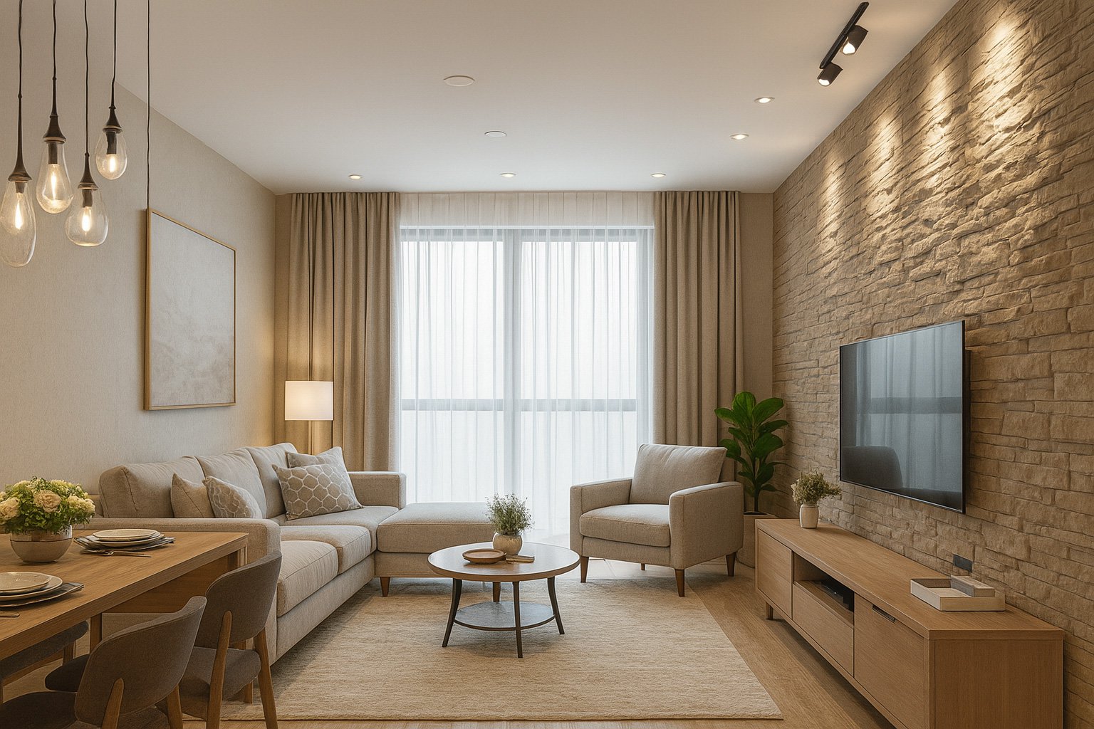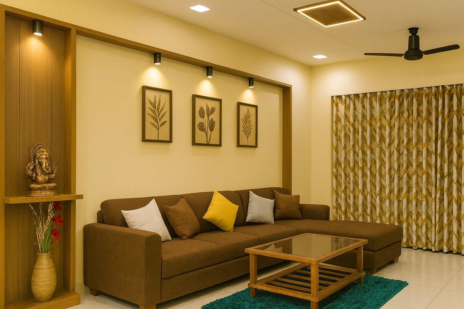 Our service includes layout planning, furniture selection, wall finishes, lighting design, ceiling work, décor styling, and customized TV unit designs—tailored to your taste and budget.