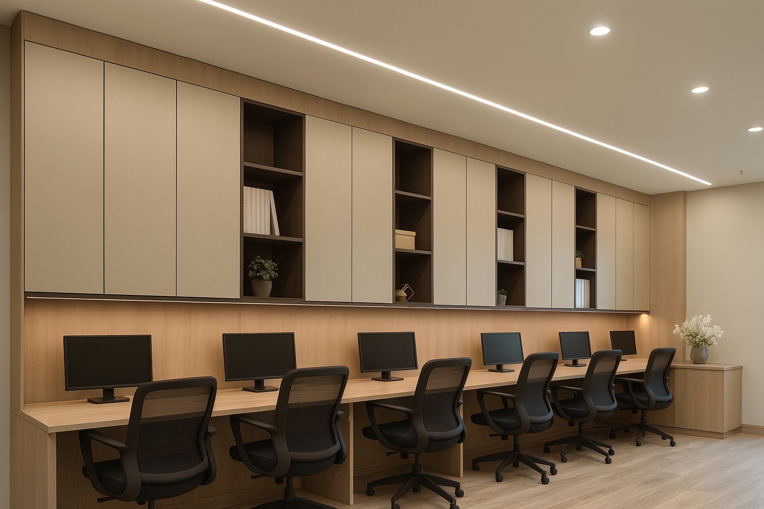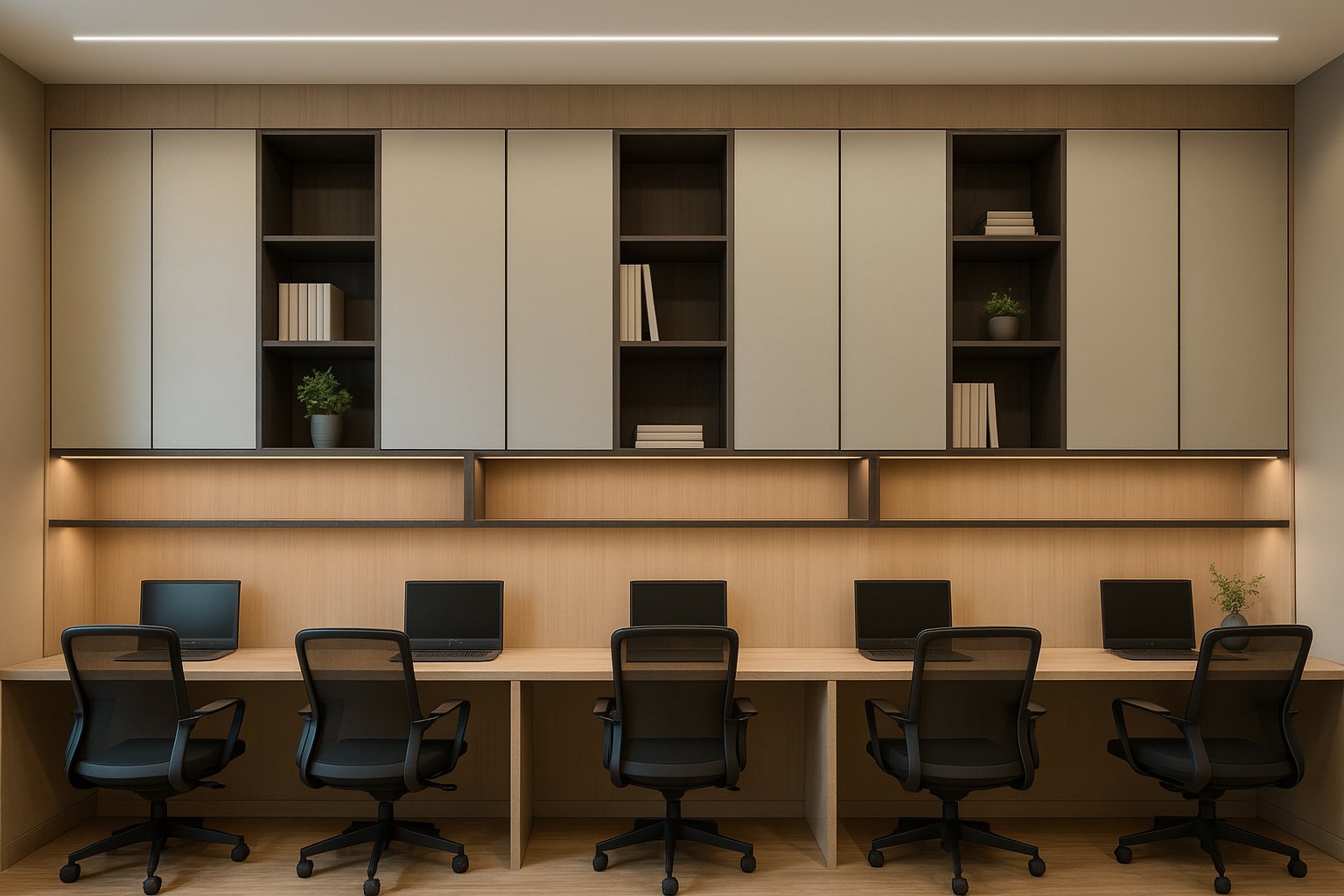 Modern minimalist office with a long built-in desk featuring seven black mesh ergonomic chairs and desktop monitors. The workspace is accented by overhead wall cabinets in neutral beige laminate, interspersed with open shelving displaying books, potted plants, and simple decor. Light wood paneling along the walls and under-cabinet lighting create a calm, inviting, and organized atmosphere. The floor is a pale wood tone, and a large vase with white flowers is placed on a side cabinet, enhancing the space's clean, professional aesthetic.