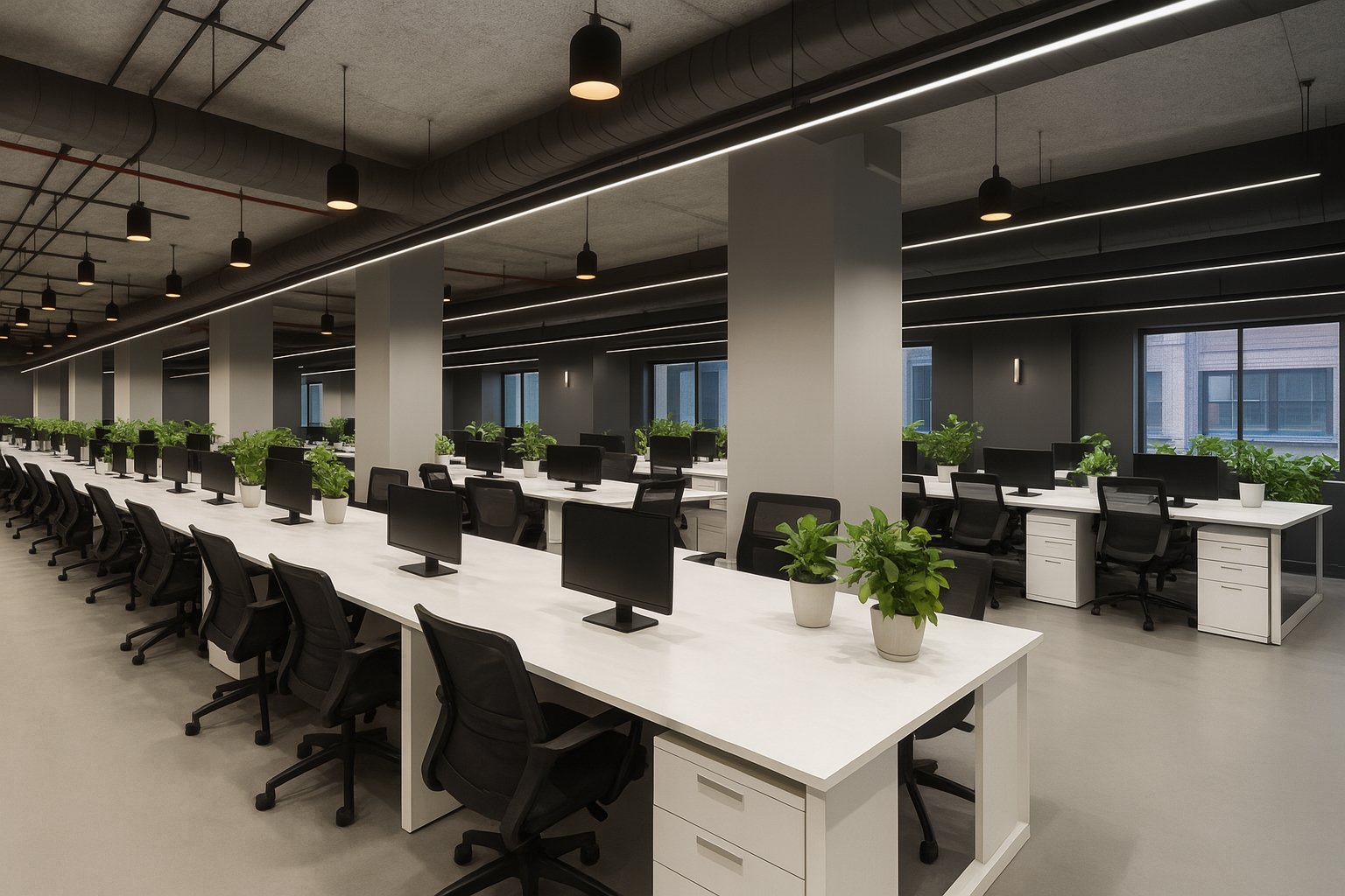 Modern open-plan office with rows of white desks equipped with black mesh ergonomic chairs and desktop computers. Each workspace features potted green plants, creating a fresh and inviting atmosphere. The ceiling is industrial style with exposed ducts, numerous pendant lights, and linear recessed lighting. Large windows allow natural light, while neutral gray walls and floors provide a sleek, minimalist backdrop.