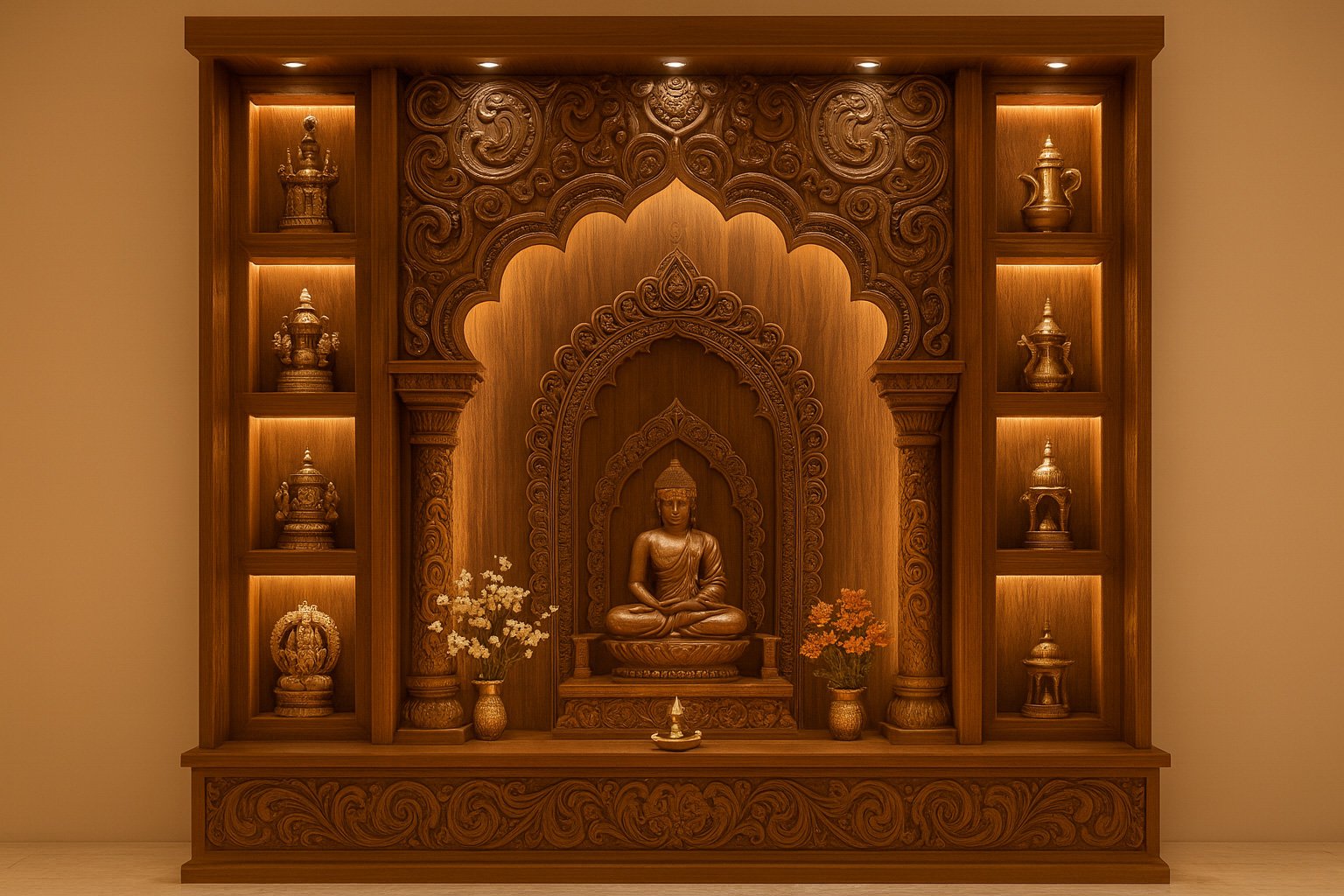 Traditional home pooja mandir crafted entirely from richly carved wood. The mandir features an intricately designed central archway with ornate motifs, showcasing a meditative Buddha statue on a raised platform. Flanking the centerpiece are multiple illuminated niches displaying brass religious artifacts and vases with fresh flowers. Warm ambient lighting highlights the detailed woodwork, creating an inviting and serene spiritual space.