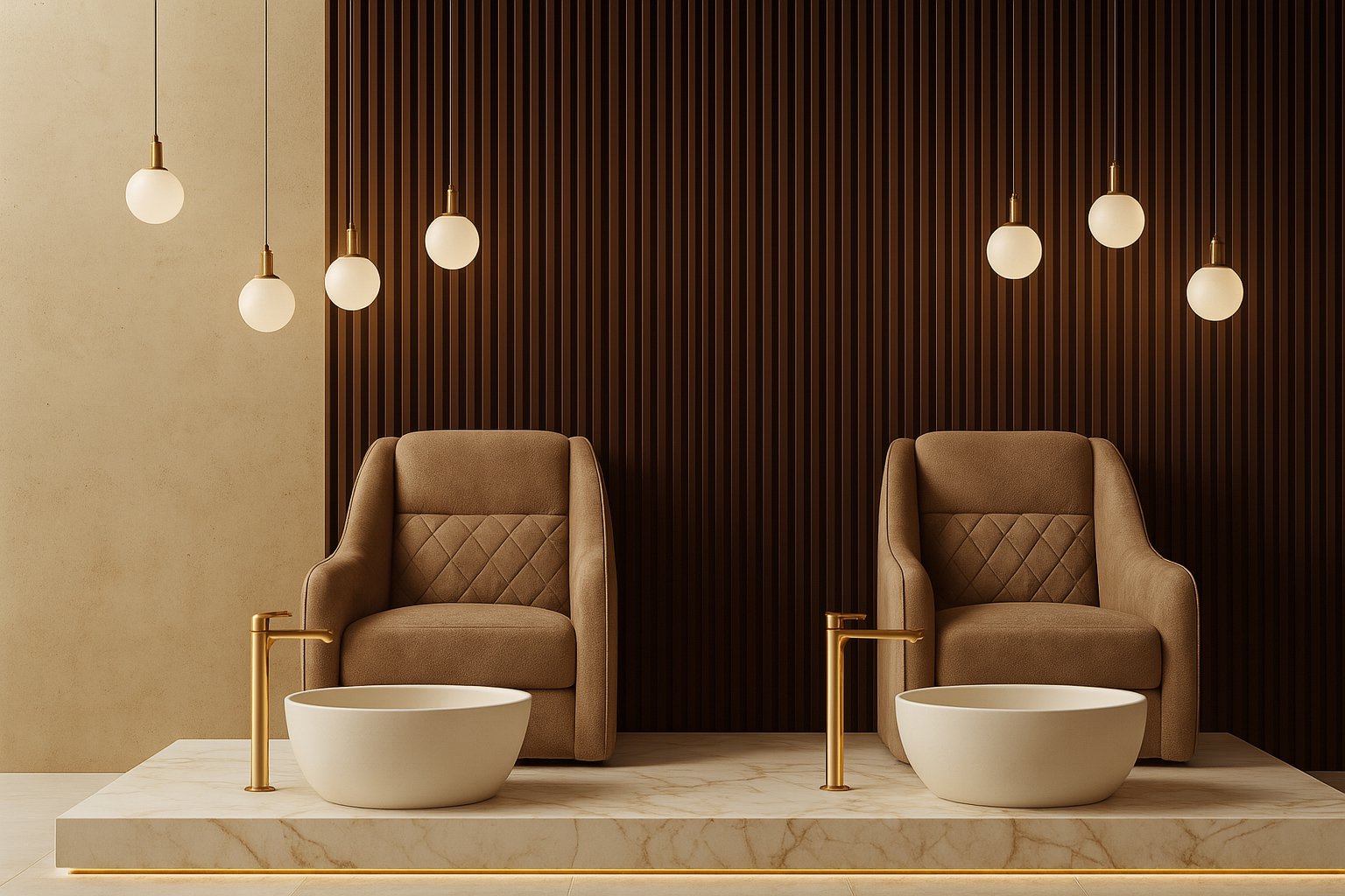 Luxury spa pedicure station with plush brown chairs, marble platform, golden fixtures, and warm ambient lighting.