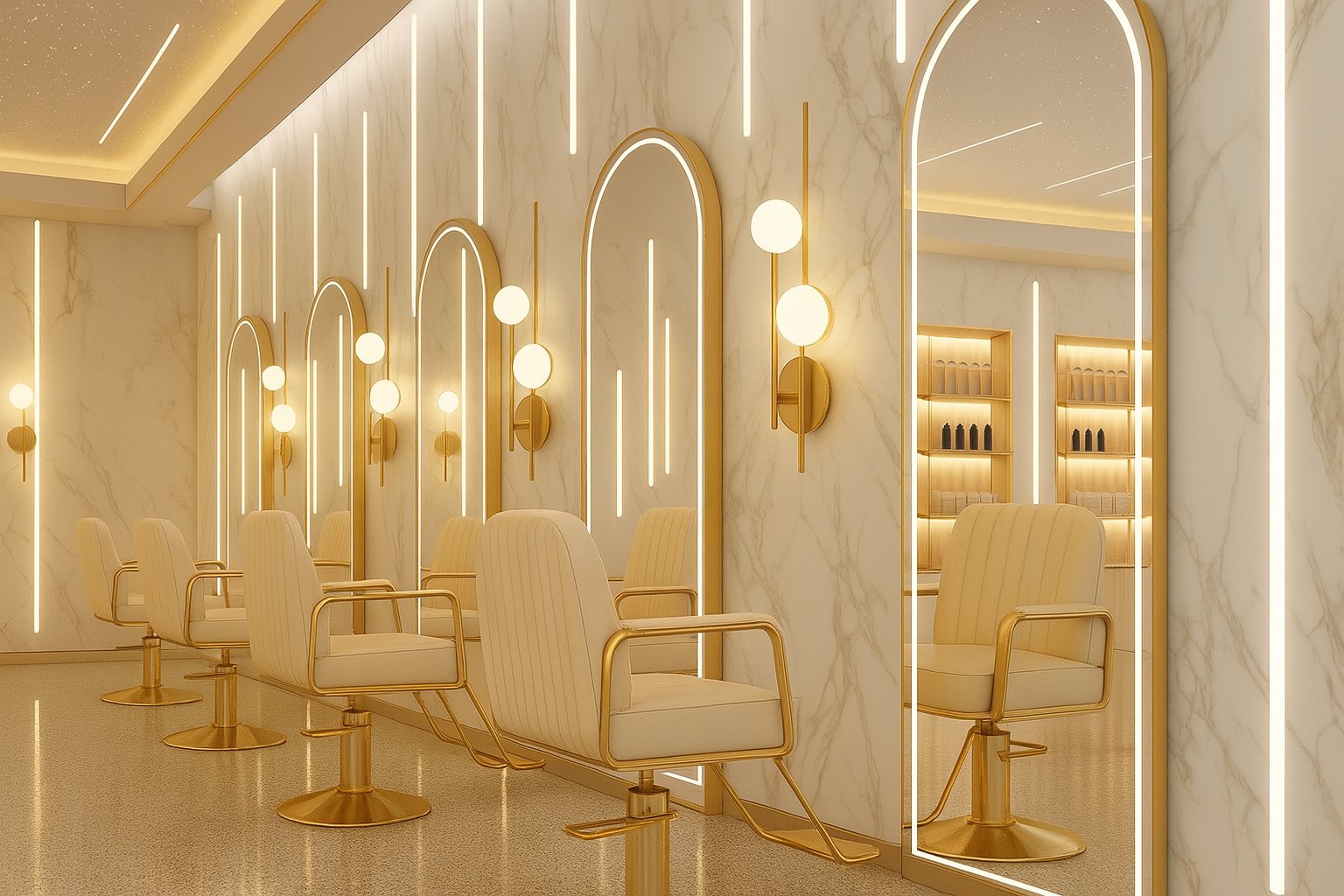 Modern luxury salon with white and gold styling stations, marble walls, and elegant lighting design.